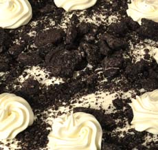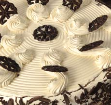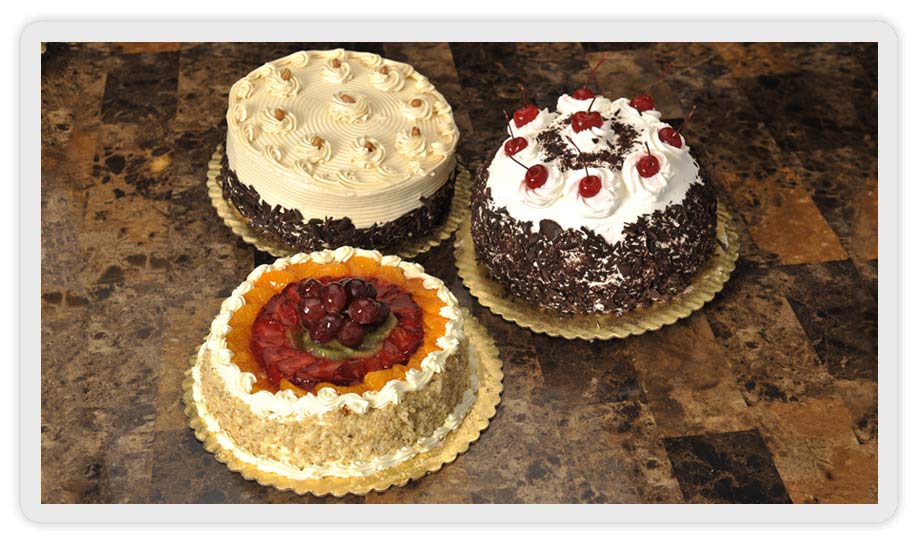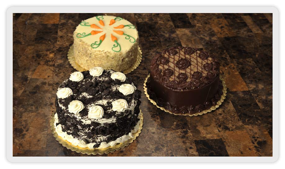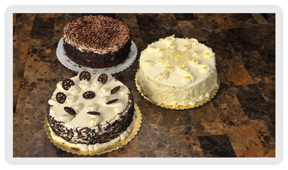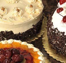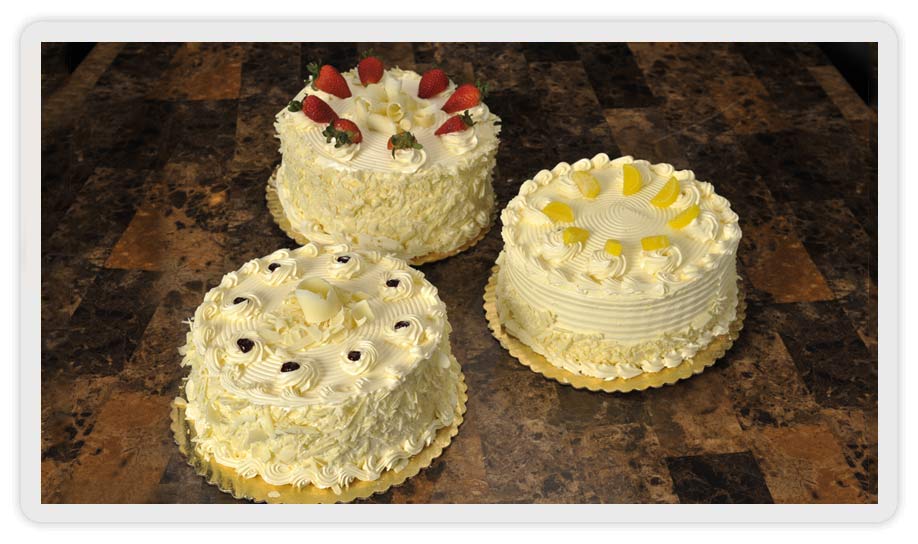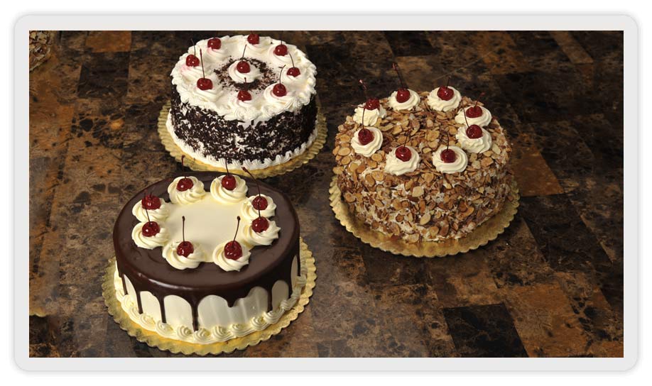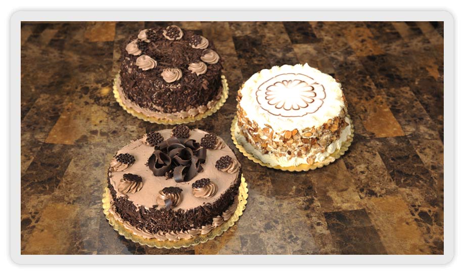 Apple Almond Flan - Flakey dough filled with Frangipan topped with Granny Smith apples and finished with a glaze Black Forest - Rich moist chocolate cake, filled with chocolate pudding, layered with cherries, whipped cream, and garnished with shaved chocolate. Bomb Cake - A rich chocolate batter, whipped cream, bananas, and strawberries (when in season) or maraschino cherries. Bostom Cream - Three layers of moist yellow cake, two layers of French custard, garnished with toasted sugar almonds, and finished with rosettes on top. Burnt Almond - Moist white batter almond with French custard, garnished with toasted sugar almonds, and finished with rosettes on top. Cappuccino - Brown sugar and nut bottom coated with ganache chocolate cream cake, filled with coffee flavored chocolate mousse, iced in coffee flavored butter cream, and finished with chocolate shavings and rosettes. Carrot Cake - Moist carrot cake with pineapple, coconut, and nuts layered and iced with a cream cheese frosting, decorated with sliced walnuts and garnished with buttercream carrots. Chocolate Mousse - Rich chocolate batter, two layers of chocolate mousse, iced with chocolate mousse, covered with semi sweet chocolate shavings, and garnished with semi sweet chocolate flans. Chocolate Pudding - Rich moist chocolate cake filled with two layers of chocolate pudding, iced in a chocolate fudge, and garnished with chocolate shavings. Chocolate Sundae - Moist chocolate cake layered with chocolate pudding, iced in butter cream, and then poured with chocolate fondant around the edges, finished with rosettes and maraschino cherries. Fresh Fruit - Moist yellow cake iced in a buttercream with shaved walnuts on the side and topped with fresh seasonal fruit, then finished with an apricot glaze. German Chocolate - Moist chocolate cake filled with one layer of German chocolate and one layer of chocolate pudding, iced with a fudge icing and topped with German chocolate and rosettes. Ho Ho (#1 seller) - Moist chocolate cake filled with three layers of buttercream, iced with chocolate fudge icing, and finished with a spidered top and rosettes. Italian Rum - Moist yellow cake filled with one layer of chocolate pudding and one layer of French custard, finished with buttercream and toasted almonds on the side with a spidered fondant on top and garnished with rosettes. Lemon Chantilly - Moist lemon cake layered with lemon mousse and iced with a lemon buttercream, finished with white chocolate shavings and rosettes. Lemon Curd - Moist yellow cake layered with lemon curd iced in buttercream and finished with white chocolate shavings, rosettes, and lemon curd. Linzer Torte - A flavorful linzer dough filled with raspberry preserves and decorated with lattice linzer dough and finished with toasted almonds. Oreo - Moist chocolate cake filled with two layers of buttercream and chopped Oreos, iced in buttercream and finished with chopped Oreos and rosettes. Peanut Butter Dream - Moist chocolate cake filled with two layers of peanut butter buttercream and finished with peanut butter buttercream, shaved semi sweet chocolate, and rosettes. Raspberry - Moist yellow cake filled with two layers of raspberry preserves, iced with buttercream and finished with white chocolate shavings and rosettes. Strawberry (Seasonal April through September) - Moist yellow cake filled with buttercream and fresh sliced strawberries, iced with buttercream and finished with white chocolate shavings, rosettes, and strawberries.