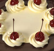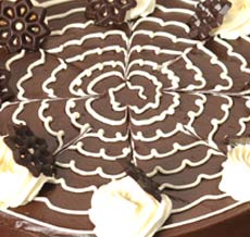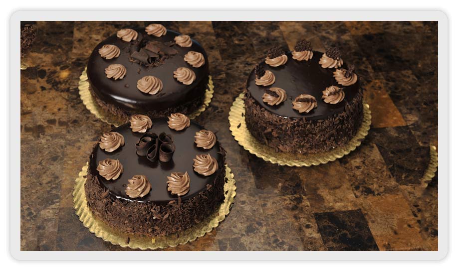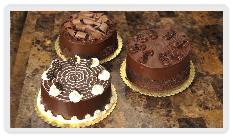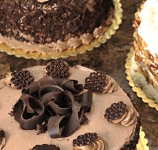 Chocolate Decadence - Dense flourless truffle like cake topped with chocolate mousse, finished with semi sweet chocolate shavings and chocolate rosettes. Chocolate Ganache - Dense flourless truffle like cake topped with chocolate mousse then poured with rich chocolate ganache, finished with semi sweet chocolate and rosettes. Chocolate Cheesecake Explosion - Cheesecake sandwhiched between two layers of moist chocolate cake and filled with two layers of chocolate pudding, poured with ganache and finished with semi sweet chocolate shavings and rosettes. Strawberry Cheesecake Explosion - Cheesecake sandwhiched between two layers of moist yellow cake and filled with two layers of fresh strawberry buttercream, iced in a buttercream icing, and finished with white chocolate shavings, rosettes, and fresh strawberries. Sinful Chocolate - Moist chocolate cake filled with two layers of chocolate pudding, poured with ganache and finished with semi sweet chocolate and rosettes. Triple Chocolate - Three layers of moist chocolate cake filled with one layer of chocolate pudding, one layer of chocolate mousse, and one layer of white chocolate mousse, poured with ganache and finished with semi sweet chocolate and rosettes. Strawberry Cream Cheese Mousse - Butter cookie bottom and moist yellow cake filled with two layers of fresh strawberry cream cheese mousse, iced with buttercream and finished with white chocolate shavings, rosettes, and fresh strawberries. Tiramisu - Rum and expresso syrup laced sponge cake, layered with a mascarpone cream cheese, topped with whipped cream, finished with semi sweet chocolate and a dusting of cocoa powdered sugar. 8 in. is $28.95 and 10 in. is $41.95 |